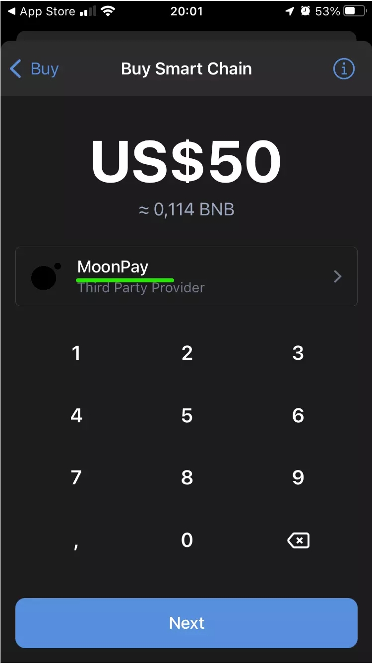 On the next screen, input the amount, select MoonPay, and press Next. You'll be forwarded to the MoonPay website.