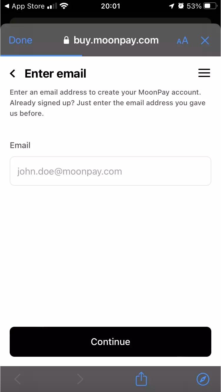 On the MoonPay page, enter your email address and press Send button to send the verification code. Check your email for a code and input it into the form.