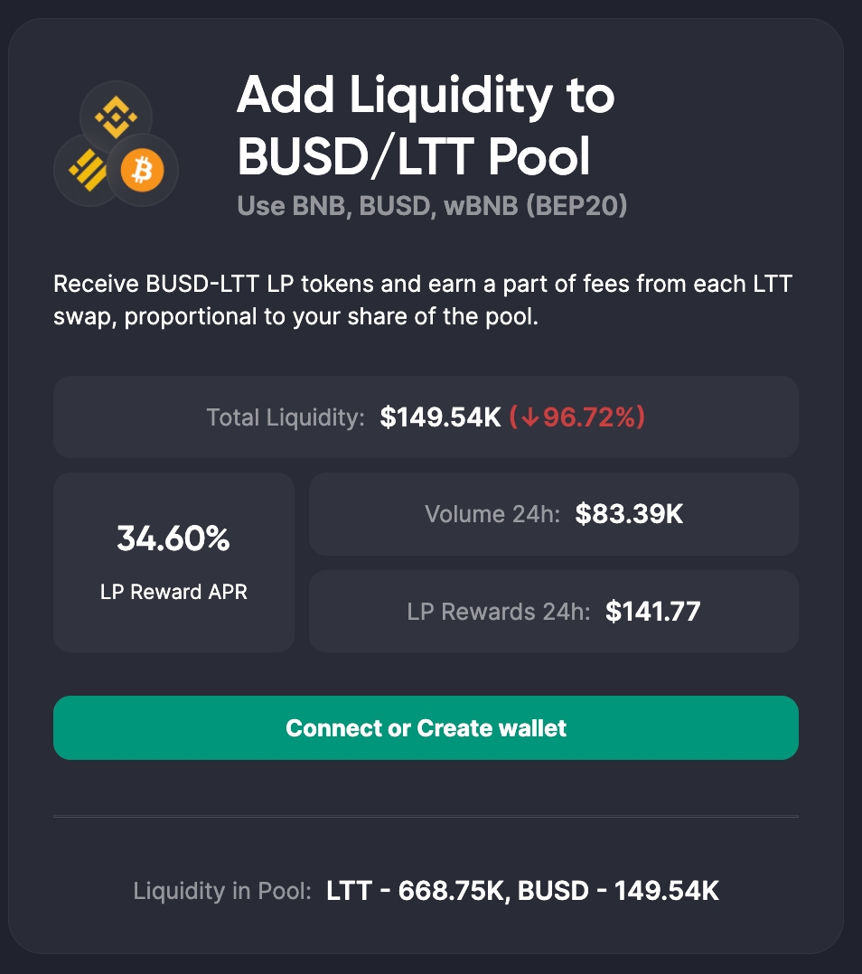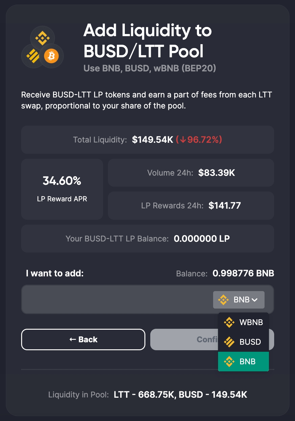 At DeFi Lab, you can use a single BEP20 token (BUSD, BNB or wBNB) and it will be auto-swapped to LTT and BUSD.