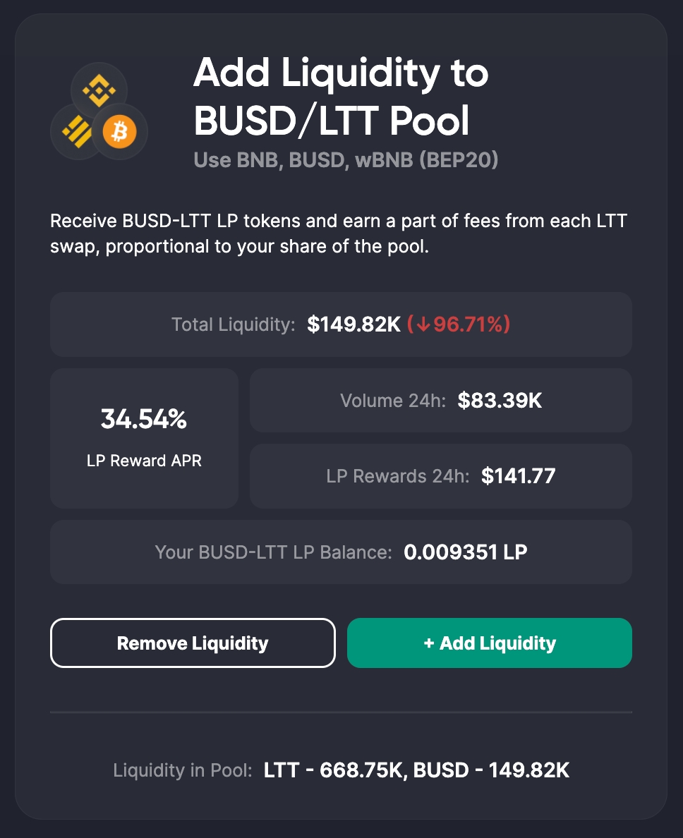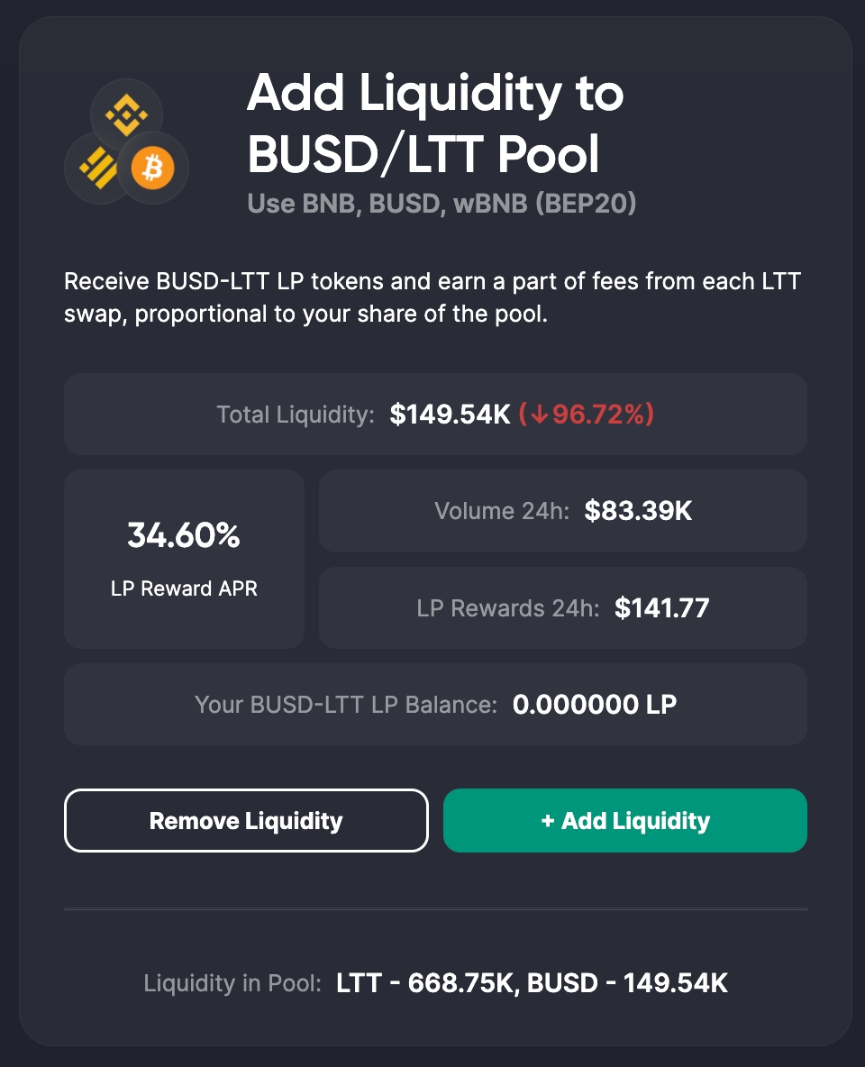 You can only remove liquidity from BUSD/LTT the pool on PancakeSwap. For a detailed guide, follow this link or open the dropdown tab below ⬇️