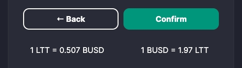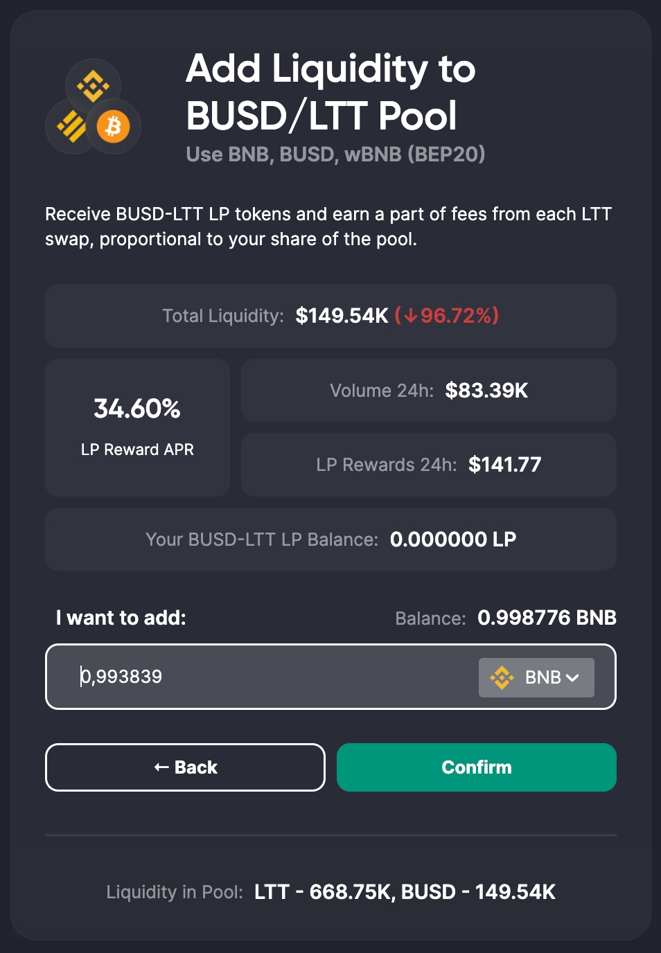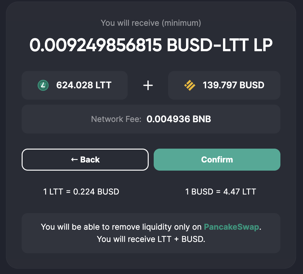 After that, you'll see the details about your future liquidity: the minimum amount of BUSD-LTT LP tokens to be received and the total value of your LP tokens.