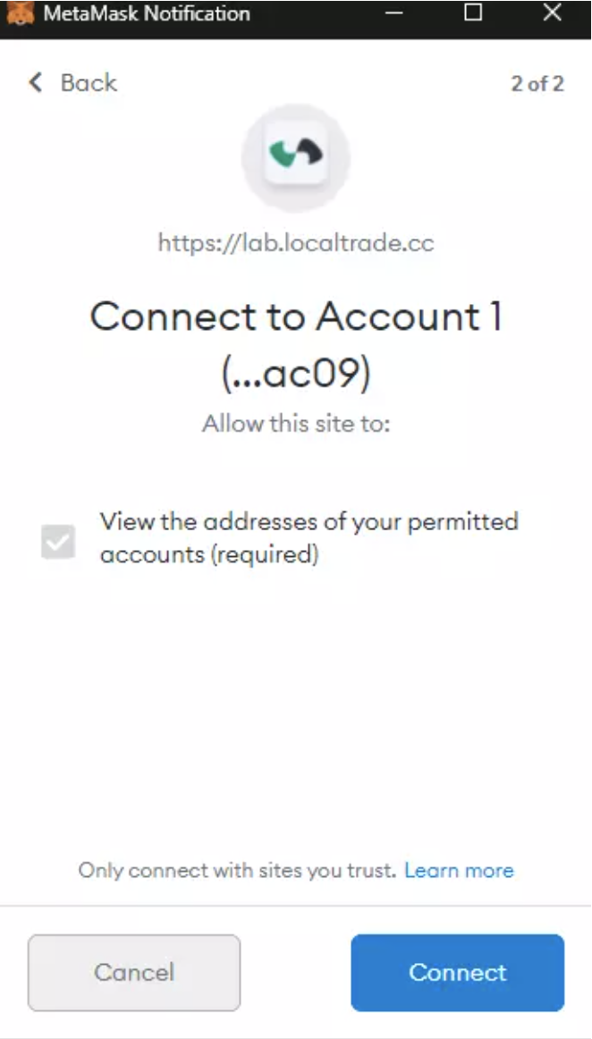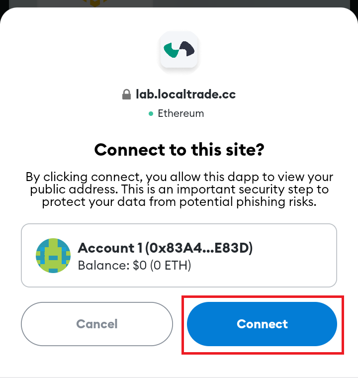A Metamask notification will appear. Tap on Connect to complete your connection to LocalTrade DeFi Lab.
