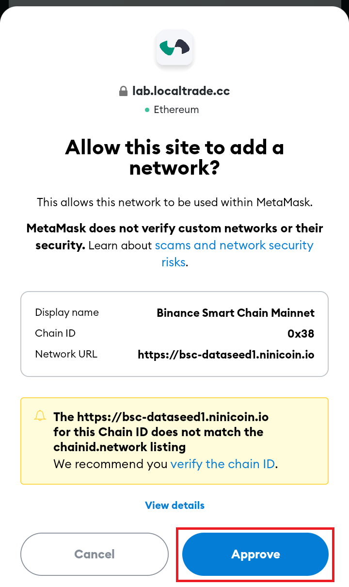 After connecting the wallet, you'll need to add the Binance Smart Chain network. Luckily, Metamask will offer to do this automatically. Press Approve to confirm adding BSC network. Please note: For Binance Smart Chain, Network URL alert might appear. No worries, this happens because BSC supports several URLs on alternative domains (binance.org, ninicoin.io, defibit.io).