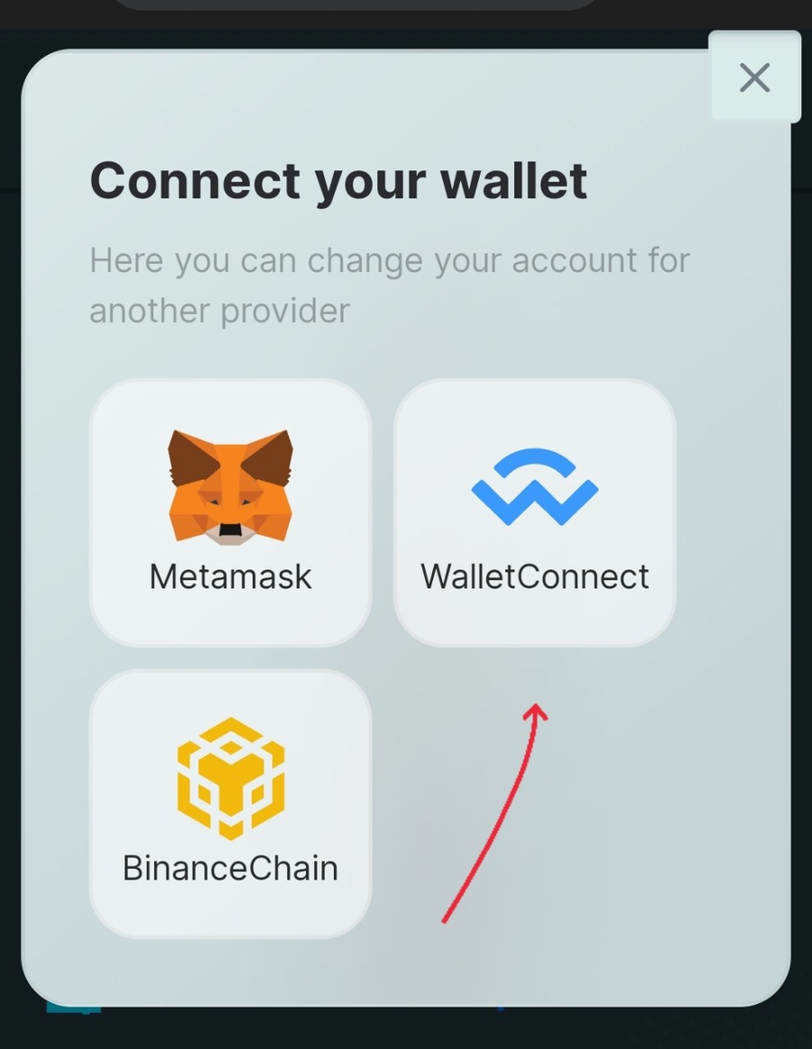 The menu will appear with several wallet options. Choose WalletConnect.