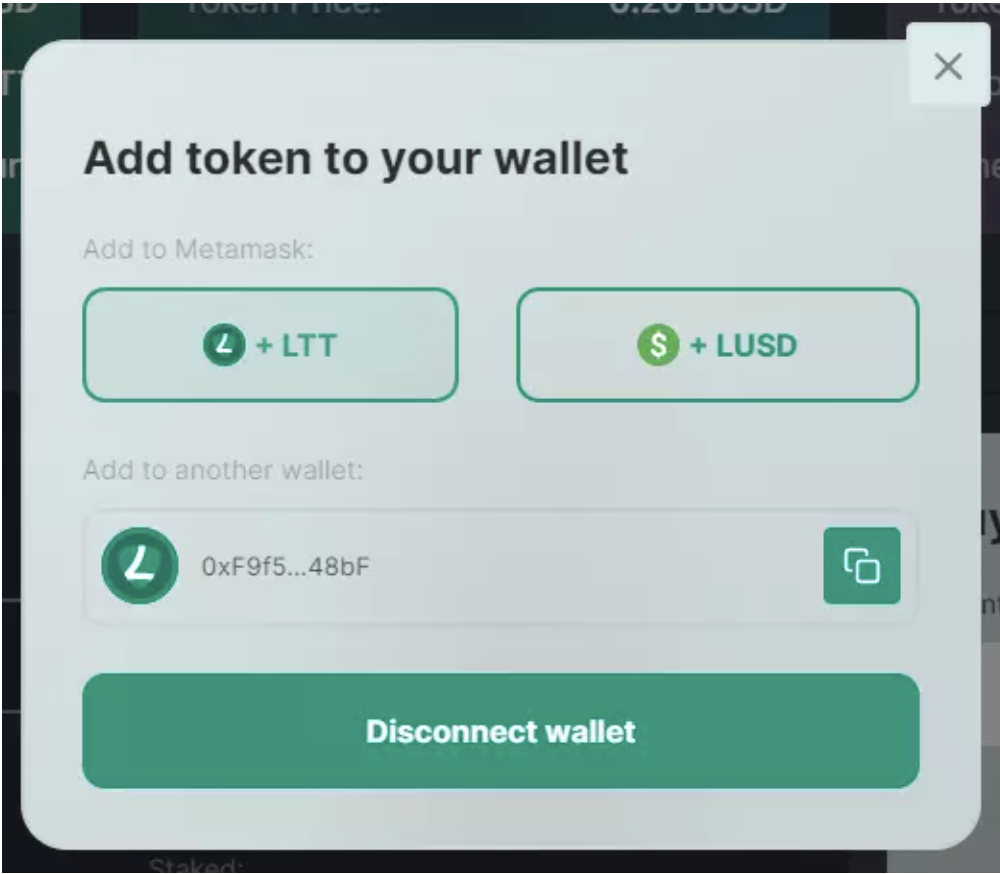 After that, youβll see an interface that allows you to add LTT and LUSD to Metamask. Click on both LUSD and LTT to automatically add them to your wallet.