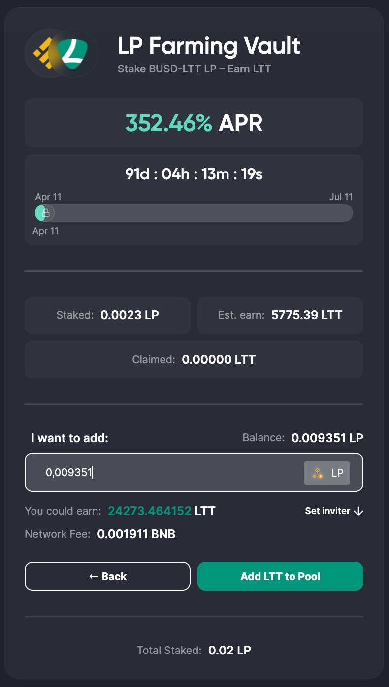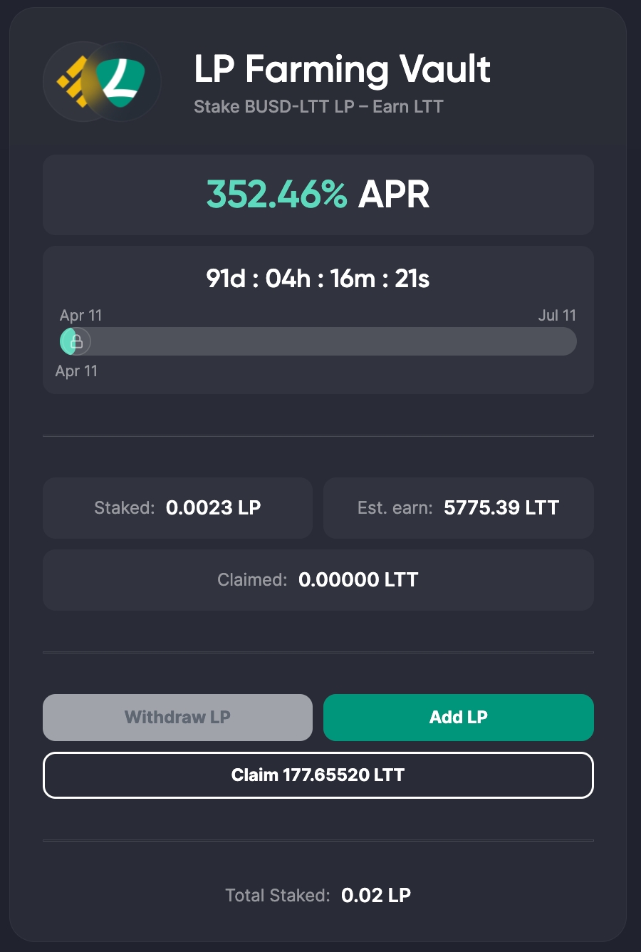 BUSD-LTT LP tokens can be staked only in the LP Farming Vault.
