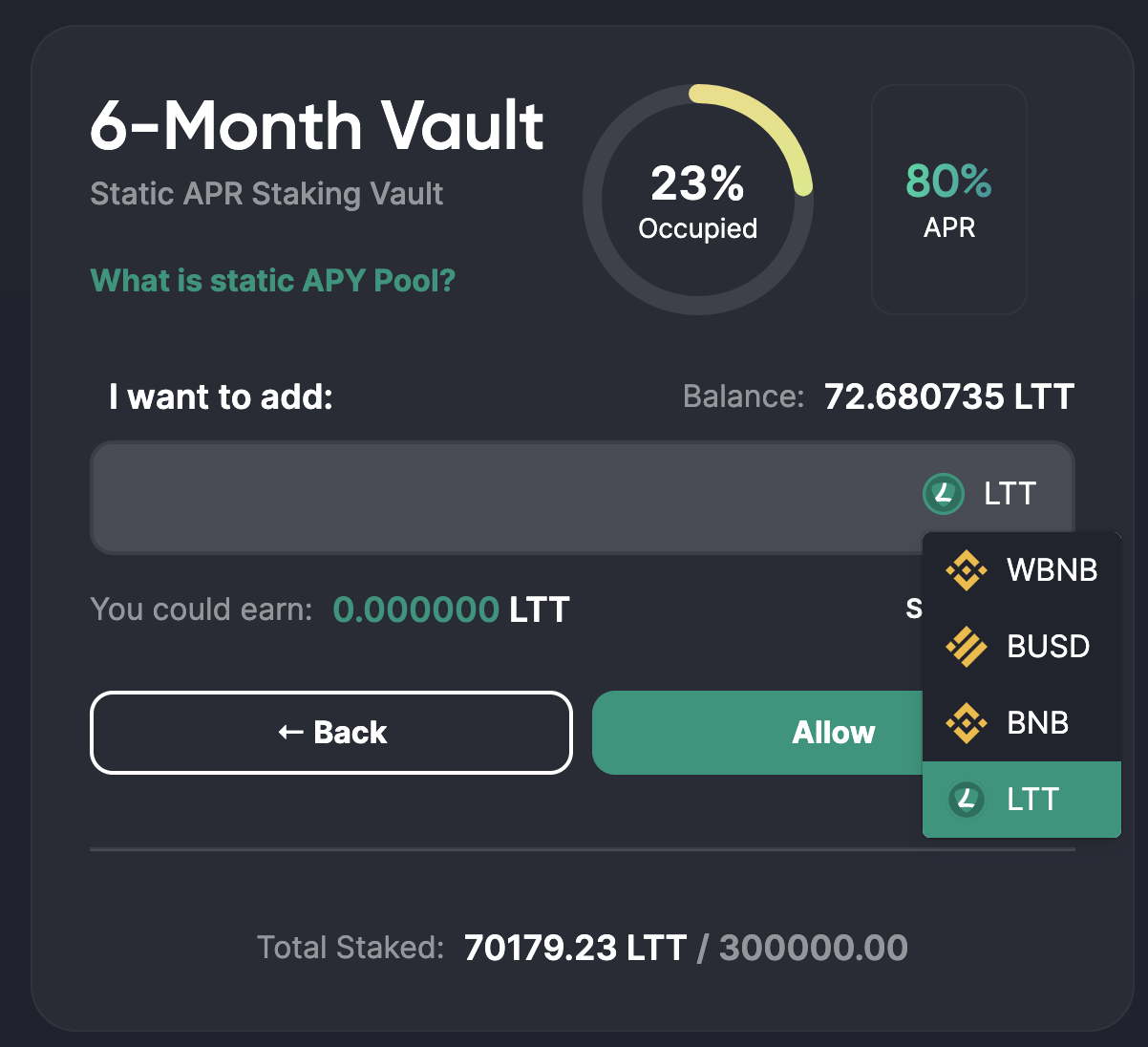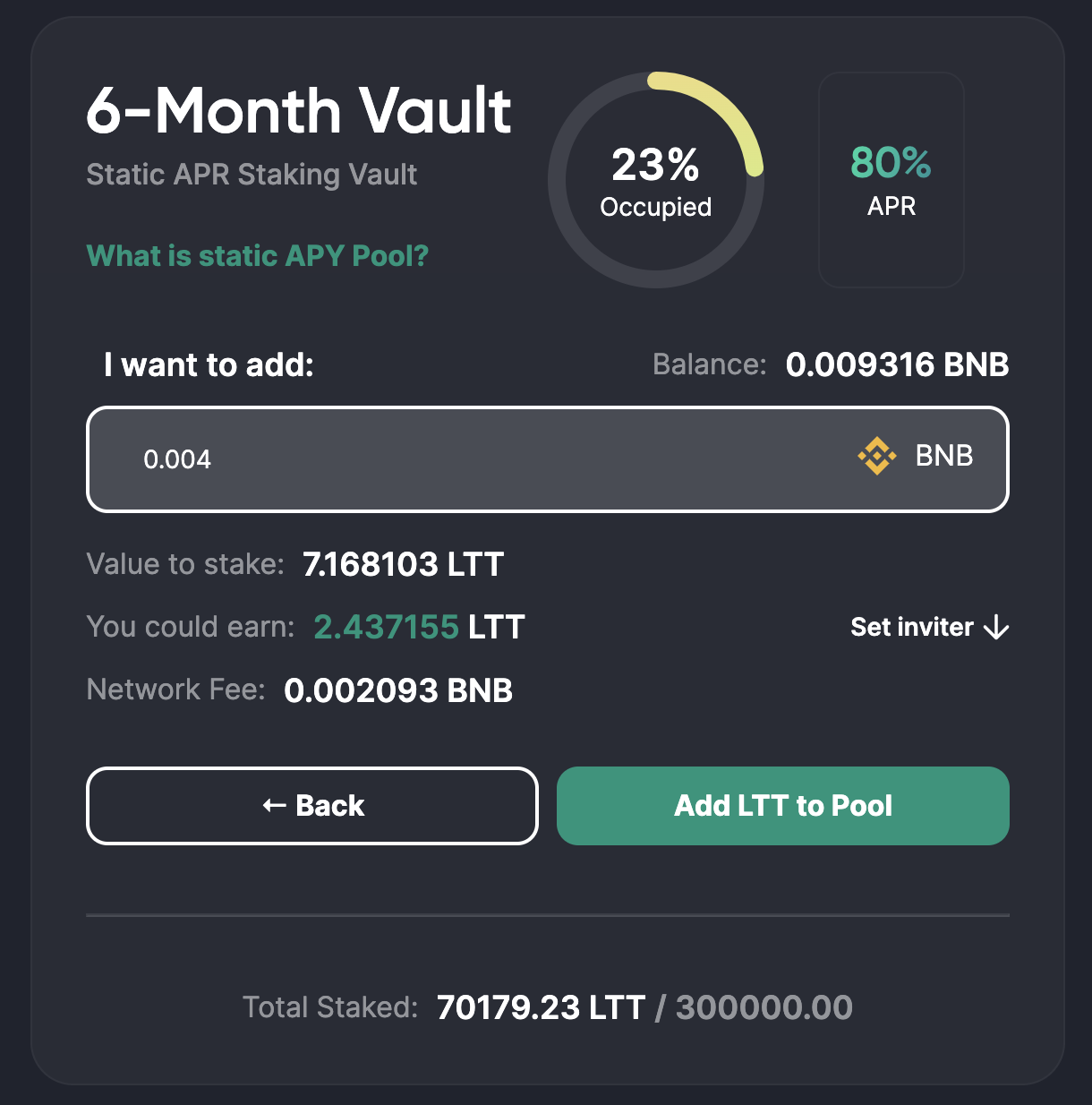 8. Type in the amount to stake in the vault. Any third-party tokens (WBNB, BUSD, BNB, etc.) will be automatically swapped to LTT upon authorizing a transaction.
