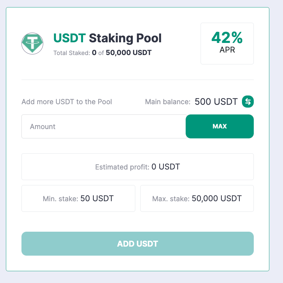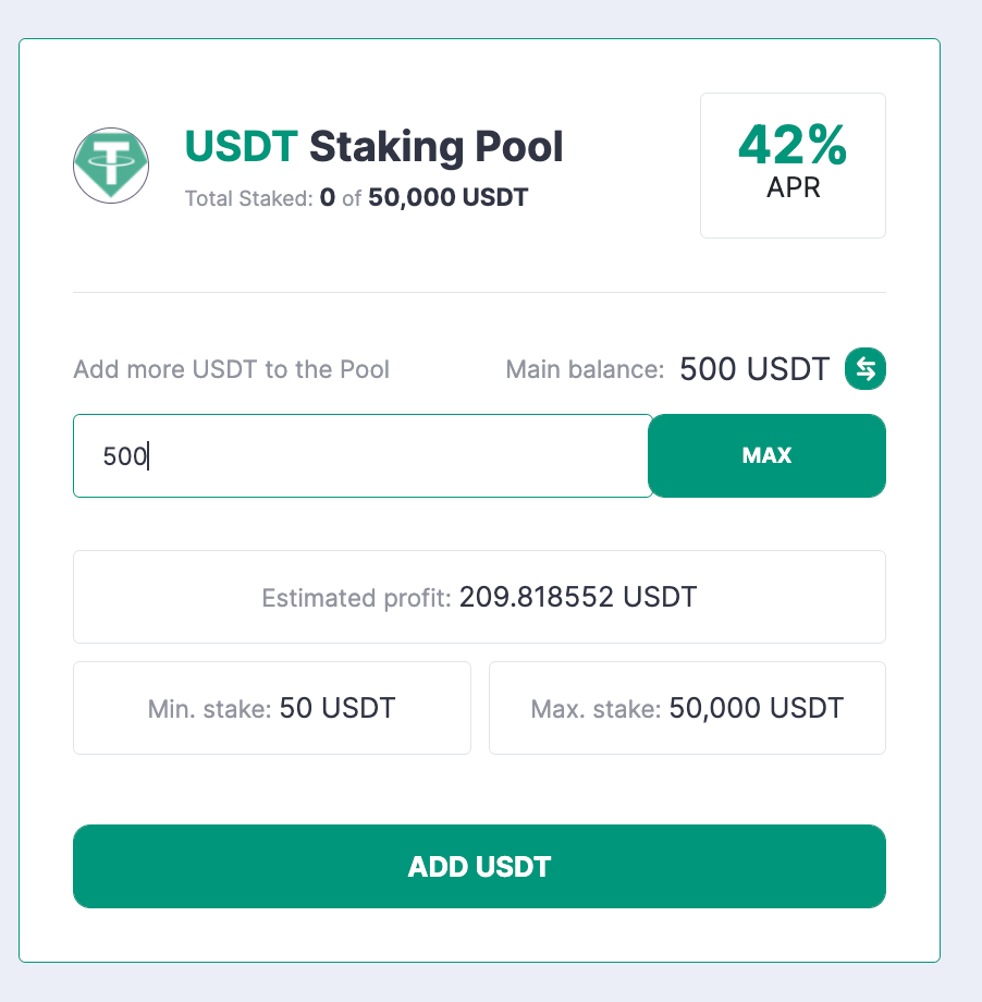 Input the amount of funds you want to stake and click on the Add USDT or Add BUSD button.