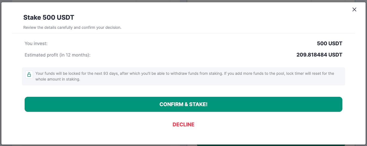 A confirmation message with your staking details will appear. Click on the Confirm & Stake button to finish staking.