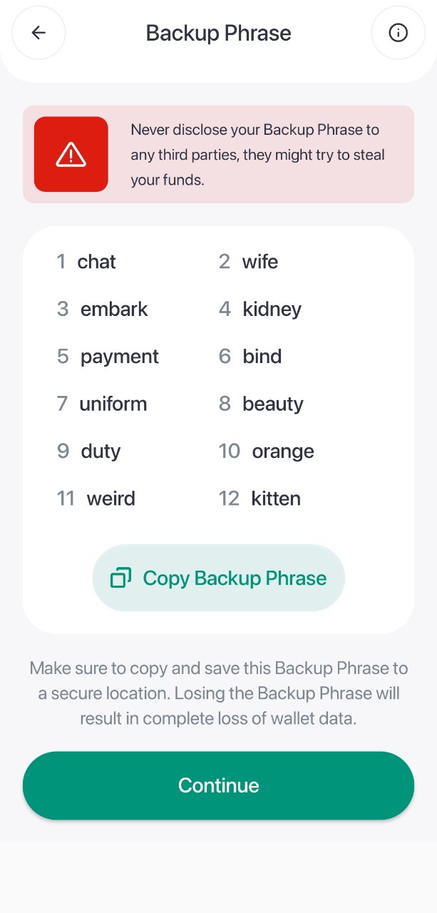Step 3. You will receive your 12 word recovery phrase, which acts as a backup key to your funds. Copy the backup phrase and store it in a safe spot.