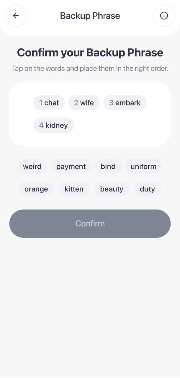 Step 4. Now you'll need to verify backup phrase. Place all 12 words in their original order.