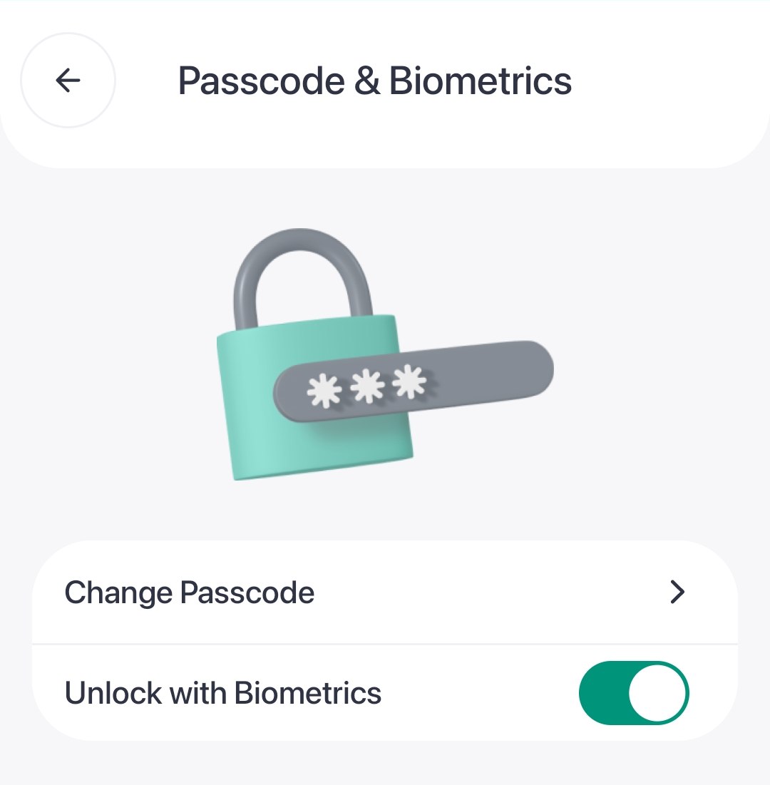 After you've created a wallet, now is the time to secure it. In order to set up enhanced security, go to Settings tab in your DeFi Wallet. Then, press on the Passcode & Biometrics button.